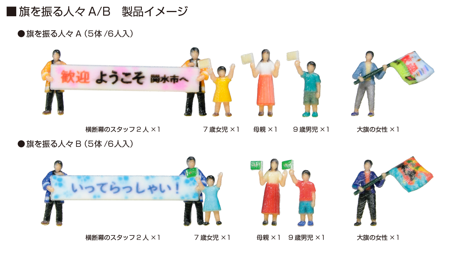 観光列車のお出迎えやお見送りのワンシーンで見られる、旗や横断幕を掲げて歓迎する様子を演出し、ジオラマにストーリーをプラスするアイテムです。