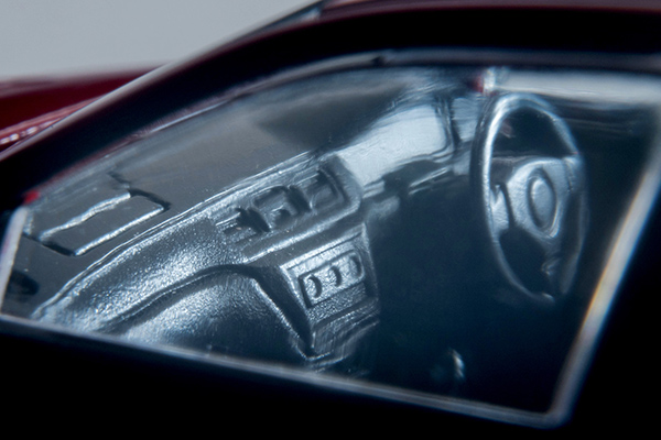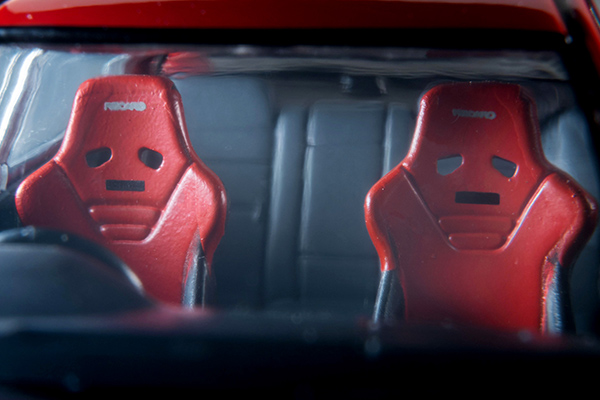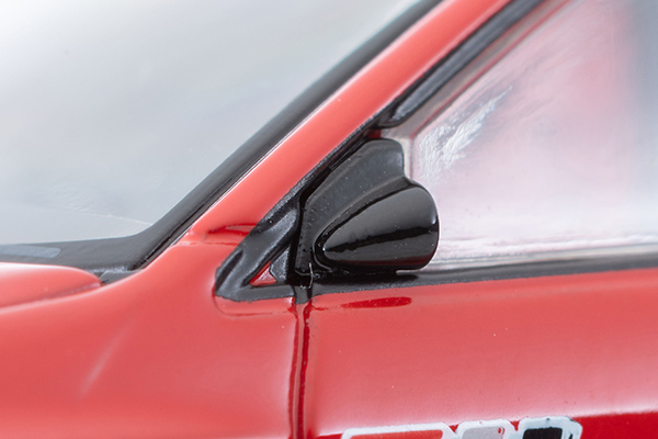 ノーマル車とは異なる形状のリップスポイラーや小型のドアミラー、細いラインを組み合わせたカラーリングの再現にもご注目ください。ボディカラーは印象の強い赤としました。