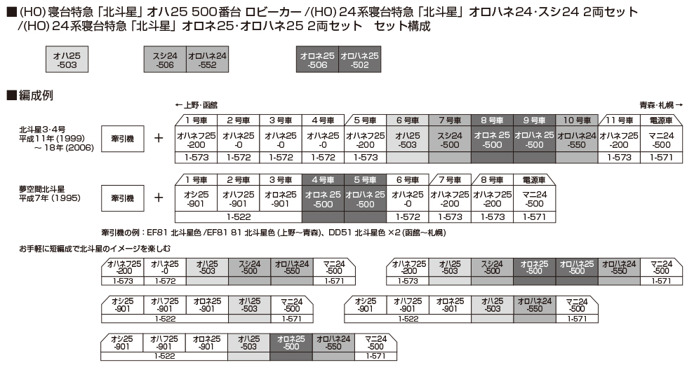 新たに製品化するオハ25 500番台を組み合わせることで、北斗星2往復時代〈平成11~18年)の北斗星3・4号の編成をお楽しみいただけます。