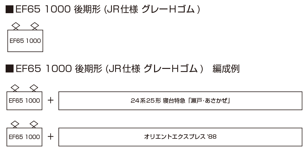 ①平成2年(1990)頃、寝台特急「瀬戸」にラウンジカーが組み込まれた時期のEF65 1000番台を製品化