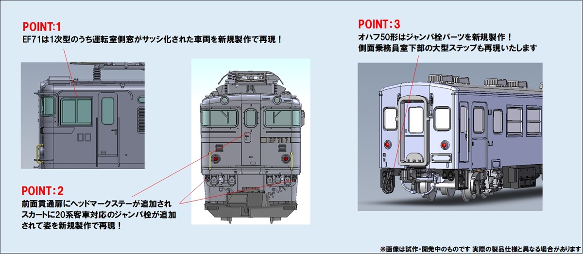 ・スカートの20系客車対応のジャンパ栓と、前面貫通扉のヘッドマークステーが追加された姿を新規製作で再現