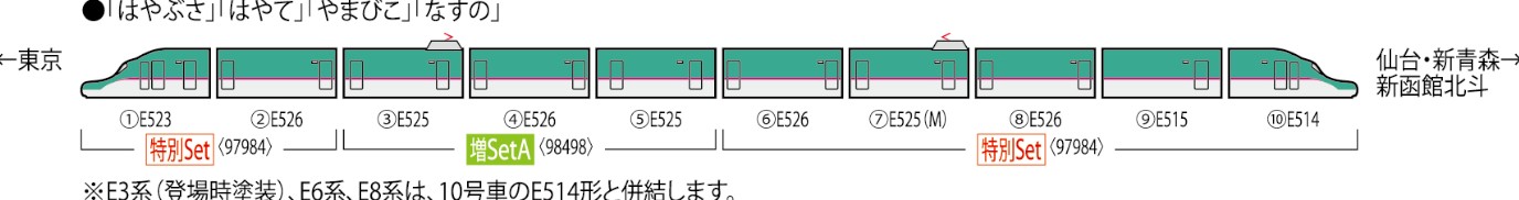・本製品(1・2・6・7・8・9・10号車)と品番98498の増結Aを組み合わせて10両フル編成が再現可能