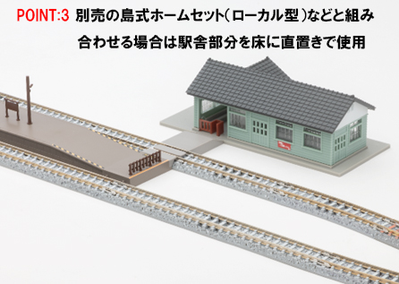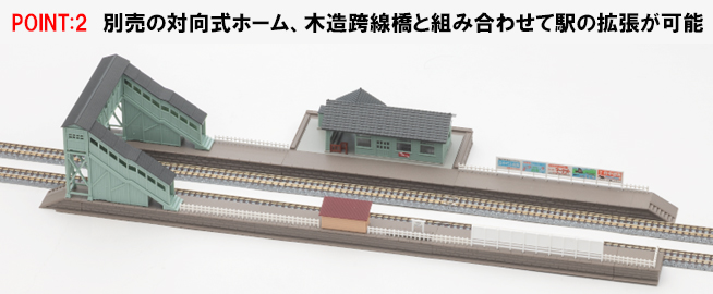 ・別売の<4001>対向式ホームセット、<4003>対向式ホーム延長部セット、<4004>木造跨線橋と組み合わせることで駅の拡張が可能