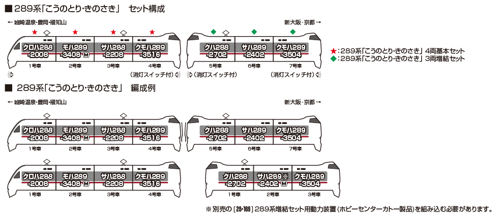 また、ホビーセンターカトーから発売の〈28-169 289系増結セット用動力装置〉を用いることで3両編成単独での走行も可能です。