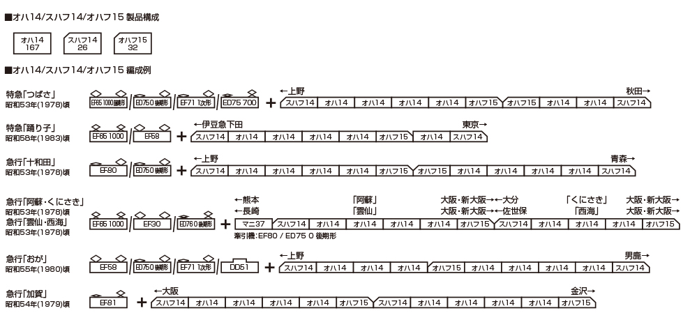 ⑨スハフ14/オハフ15は変換式愛称表示採用。「急行」「つばさ」「踊り子(イラスト)」「(無地)」