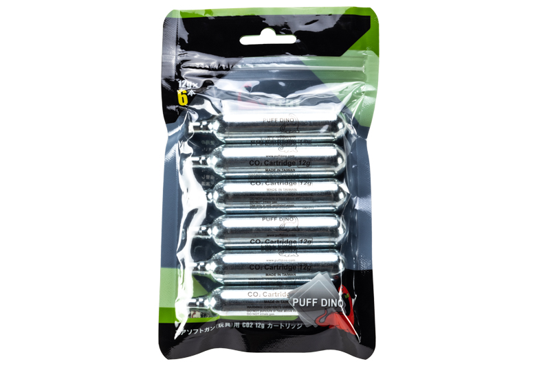 ■ 対応 CO2 カートリッジ : PUFF DINO・BASIKOS CO2 12g カートリッジ ( ※ 他ブランド CO2 カートリッジは非対応・保証対象外。BASIKOS CO2 12gカートリッジは若干全長が長いため、CO2カートリッジベースカバーが薄い G-19 CO2マガジンでは奥まで締めきれず、マガジンボトムが入りづらい場合があります)
