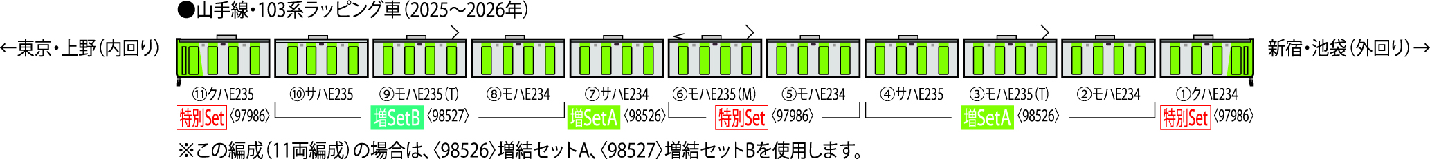 ●本製品と(1・5・6・11号車)と増結セットA<98526>、増結セットB<98527>で11両フル編成が再現可能