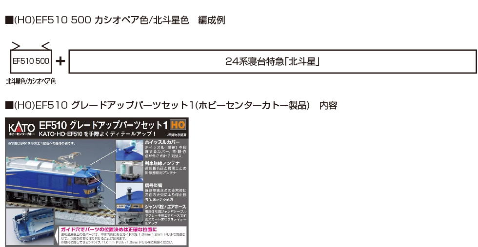 ①カシオペア色:銀色の車体側面に5色の流星をデザインした旅客用EF510カシオペア塗色を的確に再現 北斗星色:青色の車体側面に金色の流星をデザインした旅客用EF510北斗星塗色を的確に再現