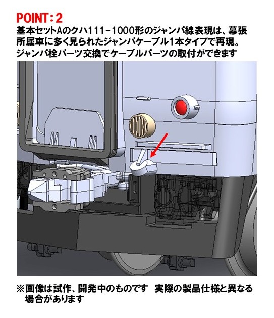 ●クハ111-1000形の前頭部ジャンパケーブルは、幕張所属車特徴の1本タイプで再現