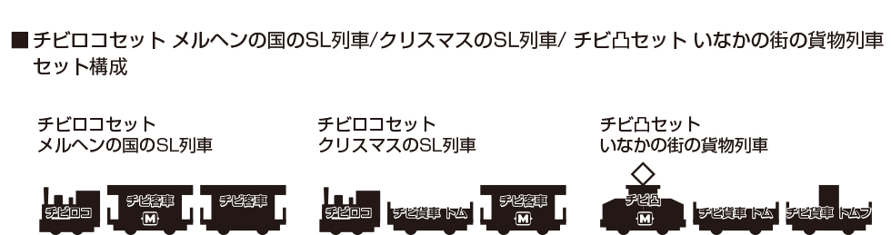 遊園地や観光地などで見かけるようなSL列車をイメージした愛らしい「メルヘンの国のSL列車」、クリスマスデザインがあしらわれた「クリスマスのSL列車」、田舎で活躍するチビ凸電機が牽く渋い貨物編成の「いなかの街の貨物列車」の3種が再登場です。