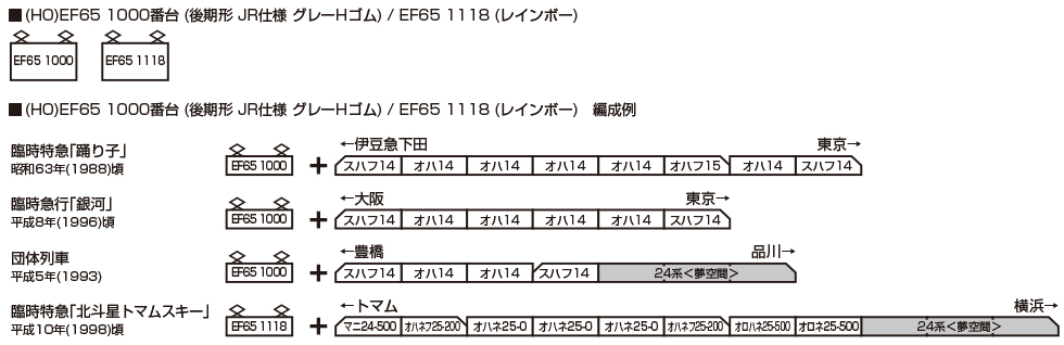 ①(HO)EF65 1000番台(後期形 JR仕様 グレーHゴム)・田端運転所所属1103号機の平成5年(1993)頃の形態で製品化・車体側面のJRマーク(白色)を再現・前面ガラス、側面ガラス、モニター窓のHゴムは灰色で再現・モニター、屋根色は黒色、パンタグラフ下部は灰色で表現・ナンバーはレタリングシートによる選択式で「EF65 1102」「EF65 1103」「EF65 1108」「EF65 1111」「EF65 1115」と「0~9」バラ数字を収録・メーカーズプレートは「東洋電機・川崎重工」「川崎重工・富士電機」、クイックヘッドマークは「踊り子」「瀬戸」「彗星(黄色文字)」「出雲」をそれぞれ付属